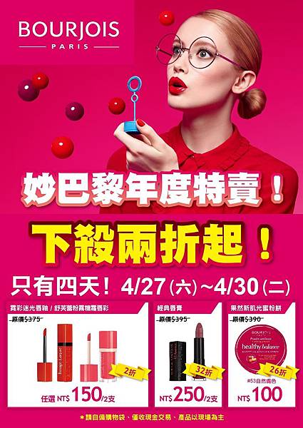 睽違兩年,Bourjois妙巴黎特賣會重新回來囉! 搶在母親節前夕給廣大的Bourjois妙巴黎粉絲們一場實體優惠盛宴, 多項絕版品將一次優惠出清,下殺兩折起優惠價格,100%正貨保證,活動將於2019年4月27日到4月30日起為期4天,商品數量有限,售完為止。